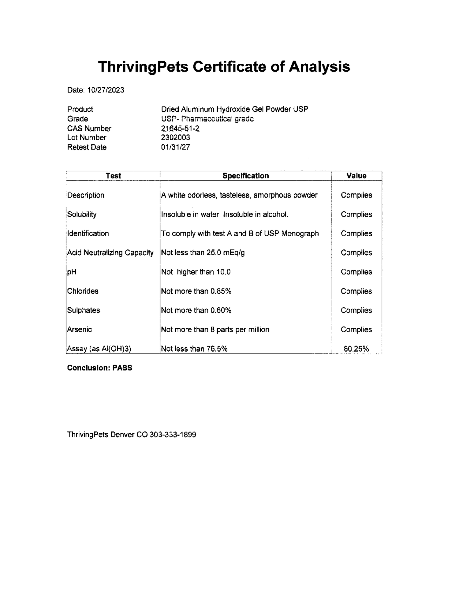 ThrivingPets Aluminum Hydroxide Fine Powder USP is the highest quality, most potent, and safest product on the market. Our product meets the USP standard for safety by guaranteeing safe levels of heavy metals and arsenic. Non-USP grade products may contain unsafe levels of arsenic and heavy metals.